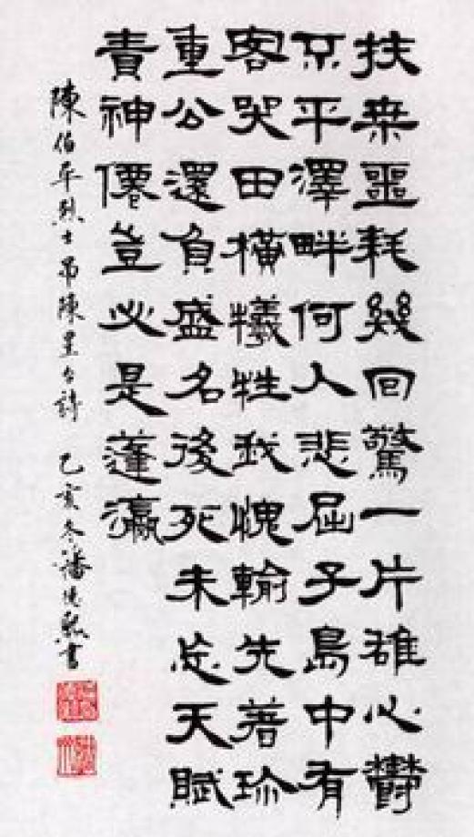 陈伯平烈士《吊陈星台》诗。乙亥冬.潘德熙书。 潘德熙(1926- ),浙江嘉兴人。上海《书法》杂志编辑,西泠印社社员。此篇书体为隶书。