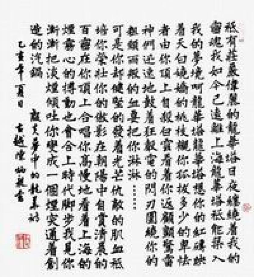 殷夫《梦中的龙华》诗,乙亥年夏日,古越陈炳昶书。 陈炳昶(1940-1999)浙江绍兴人。中国书协和上海书协会员。此篇书法为楷书。