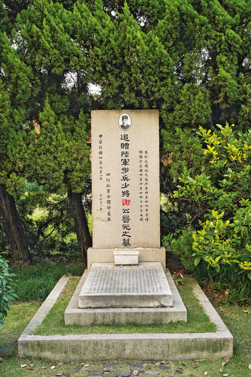 谢晋元烈士原葬于余姚路 331 弄。 1983 年 4 月 15 日,经上海市人民政府同 意,谢晋元烈士墓迁至上海市万国公墓 (宋庆龄陵园前身)。谢晋元烈士墓由立 碑和卧碑组成。立碑长 0.77 米,宽 0.15 米,高 1.56 米,花岗石,上方镶嵌谢晋 元遗像,中间刻“追赠陆军步兵少将谢公 晋元之墓”,右刻“生于民国纪元前七年 四月廿六日子时 殉难于民国卅年四月廿 四日上午五时”,左刻“四行孤军全体部属敬 中华民国卅年七月一日 永嘉马公愚敬书”。卧碑长 0.8 米,宽 1.6 米,高 0.12 米,为大理石。卧碑上方置方形大理石香炉,刻有“谢晋元将 军纪念碑”,碑文主要介绍谢晋元生平、坚守四行仓库、遇害经过、当时 家人情况等。