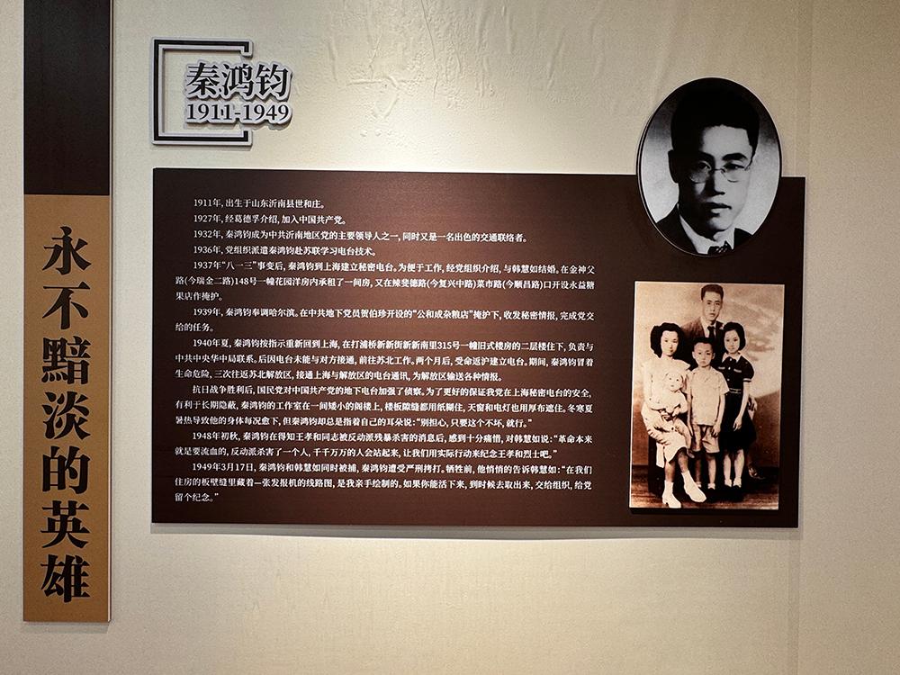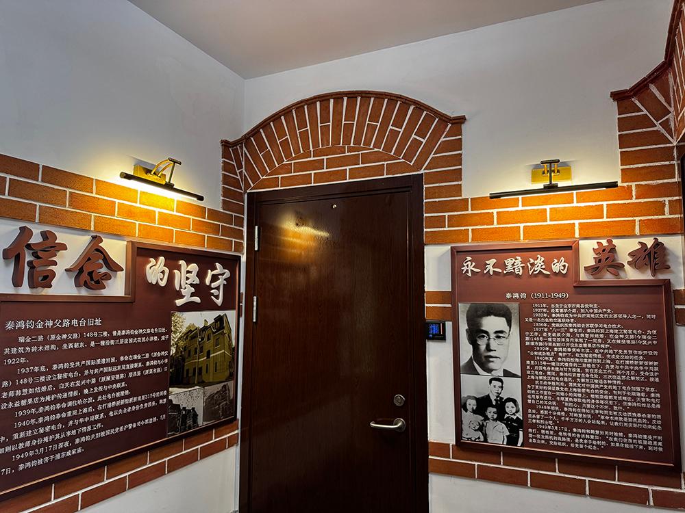 在一楼入口处,电子屏幕上播放的是秦鸿钧秘密电台旧址的概况介 绍、秦鸿钧后代(孙子)介绍秦鸿钧的生平事迹宣传片。走上木纹楼梯, 一幅幅记载着点滴过往的黑白照片和历史资料展现在眼前,楼梯墙面上展 陈了秦鸿钧烈士的遗物照片画。在三楼旧址处,展示了秦鸿钧个人简介展 板以及秦鸿钧秘密电台旧址概况展板。