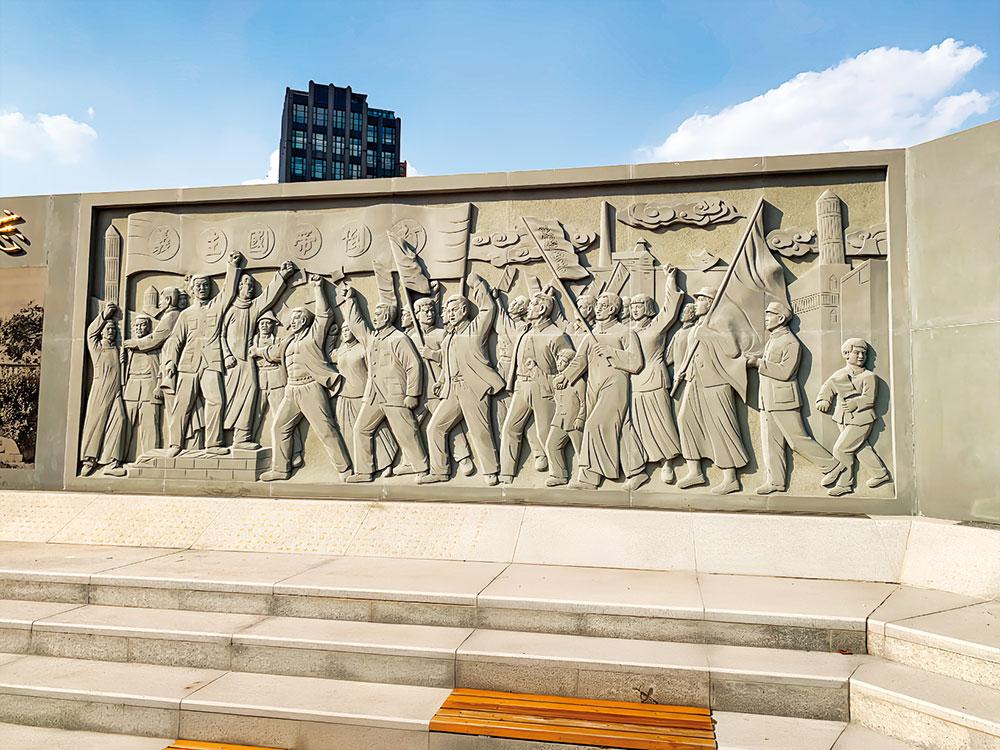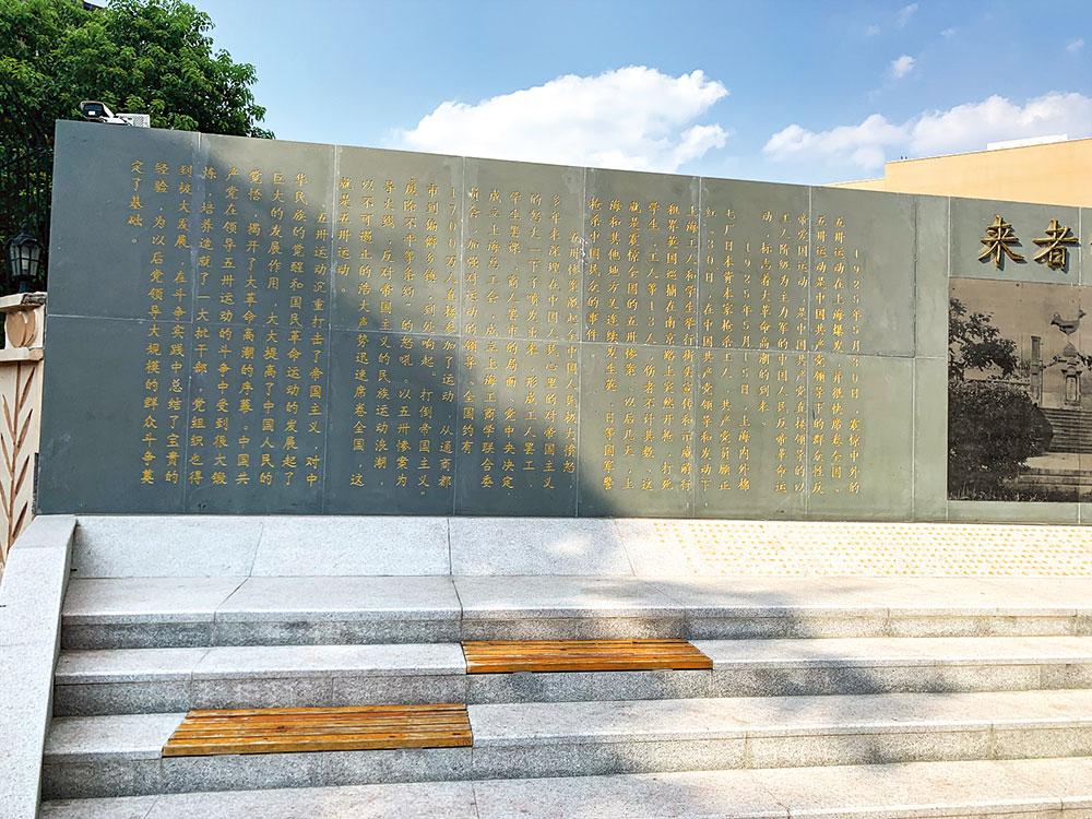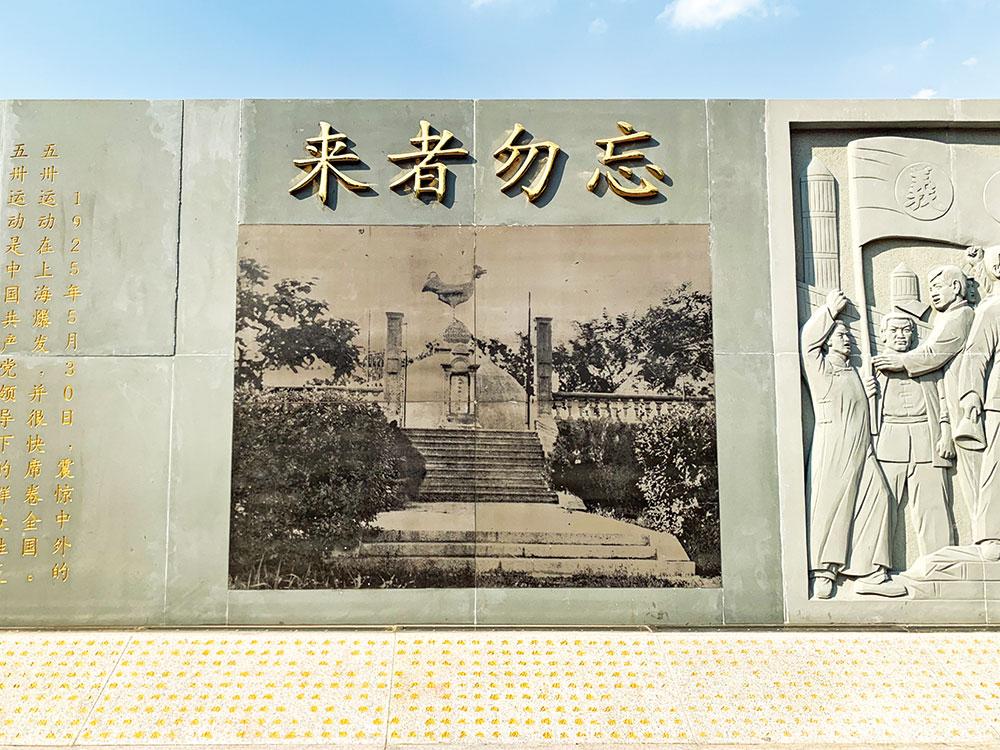 新建的“五卅”烈士纪念广场景观墙长约 14 米,中间镌刻历史纪念 碑亭上“来者勿忘”4 个字;一侧雕刻五卅运动人物群像;另一侧刻五卅 运动史实。墙体前方斜卧石碑,刻录了蔡元培所撰的碑文。原五卅烈士墓遗址纪念碑立于纪念广场东首。