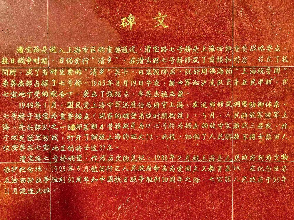 1949年1月,国民党上海守军为固守上海,在近郊修筑碉堡防御体系,七号桥碉堡为重要据点。5 月,人民解放军进军上海,先头部队与以七号桥为据点的敌守军激战三昼夜,终于攻克敌军防线,打开了解放上海的西大门。此役,牺牲了人民解放军将士数百人,仅安葬在七宝地区的将士达 37 人。
