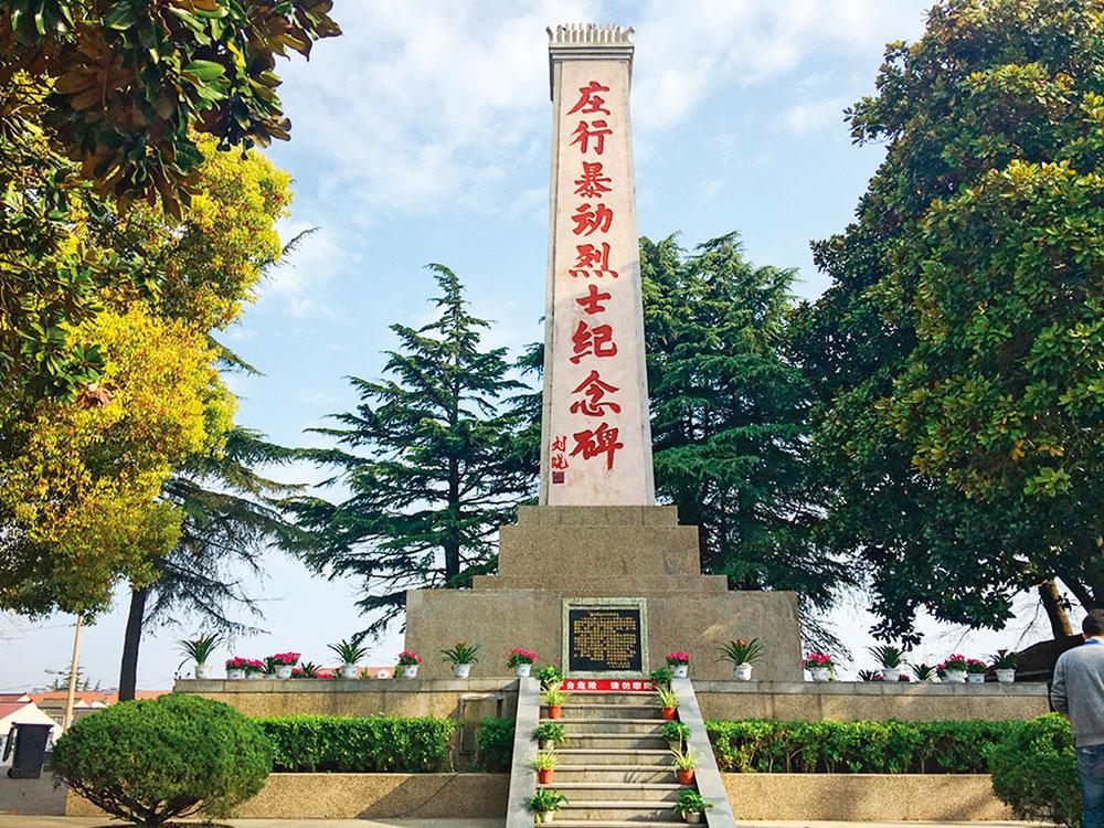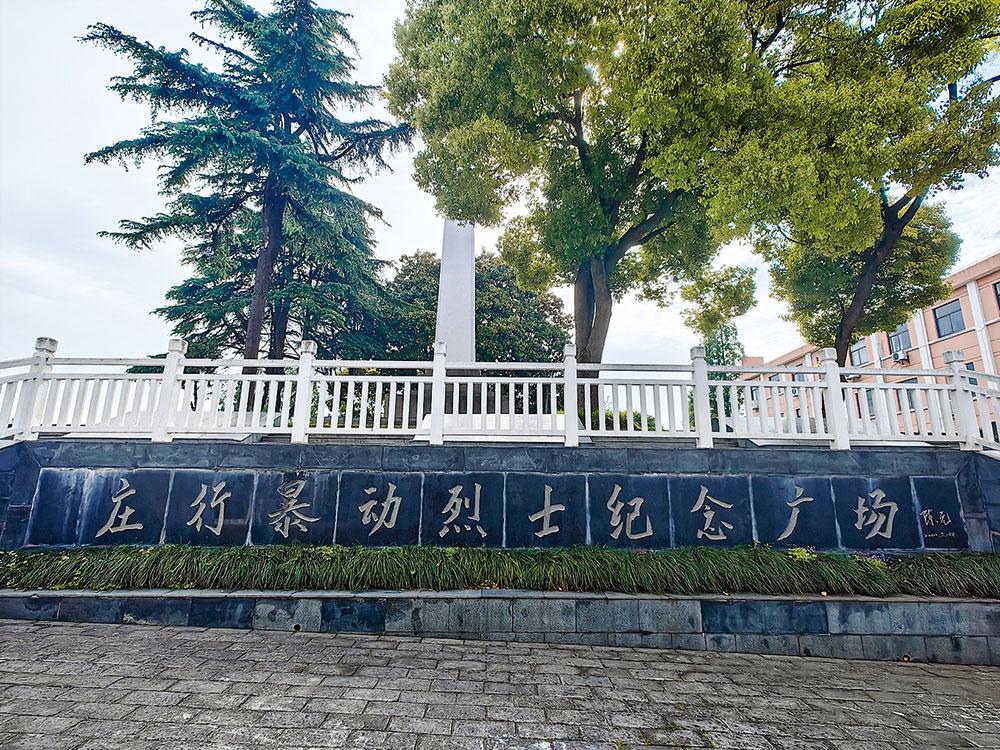 庄行暴动烈士纪念碑始 建 于 1967 年,1986 年、2008 年、2017 年先后三次进行提 质改造。 庄行暴动烈士纪念碑坐 北朝南,碑身高 15.7 米,座 12.2 米见方,由庄行暴动领导人、外交部原副部长刘晓题写碑名。纪念广场由庄行暴动领导人陈云长子陈元题名,建有 5 块黑色花岗 岩,铭刻烈士事迹。纪念碑后建有庄行暴动五烈士墓,安葬唐一新、吴大 龙、黄多生、冯银楼、张四弟 5 位烈士。