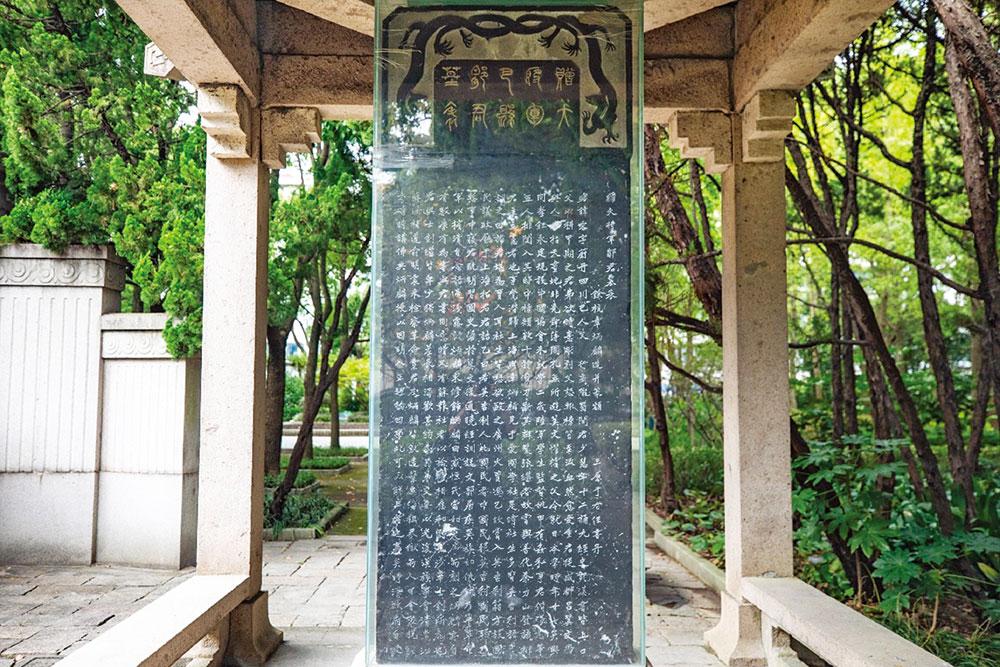 邹容墓的墓台坐北朝南,面向大道,两边是长方形绿化区,四周遍植 松柏,庄严肃穆。墓前有一座高 2.4 米的塔形墓标,上书“邹容之墓”4 个大字。墓标后为圆筒状墓冢,高 2.36 米,直径 2.48 米,墓前有一座高1.6 米的墓志铭石,有章太炎所书“赠大将军巴县邹容墓”,碑额上雕有双 龙。墓东西两边各有一座石亭,东为 1924 年所立《赠大将军巴县邹容墓 表》石刻,西为《赠大将军巴县邹容之墓志铭》石刻。