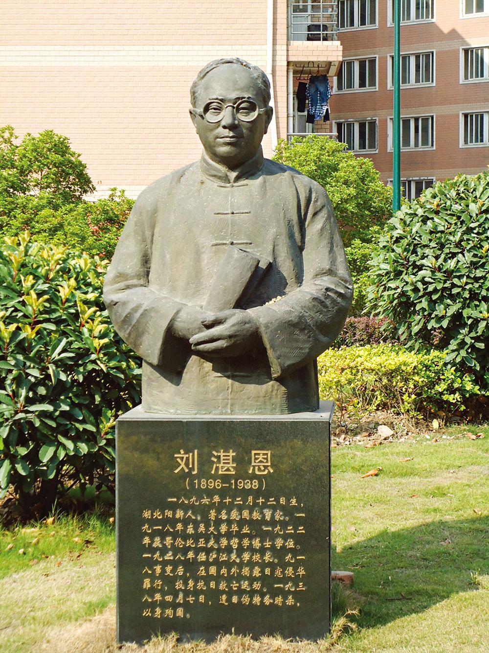刘湛恩(1896—1938), 湖 北 阳 新 人。 早年留学美国。1923 年在上海任中华基督教 青年会全国协会教育总干事。1928 年任上 海沪江大学首任华籍校长。1932 年一·二八 淞沪抗战爆发后,积极参加抗日救亡运动。 1937 年八一三淞沪抗战期间被推举担任上 海各界人民救亡协会理事、上海各大学抗日 联合会负责人。上海华界沦陷后拒绝出任伪 职,1938 年 4 月遭日伪特务枪杀。