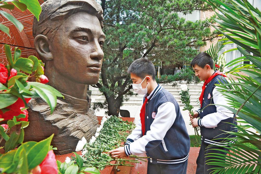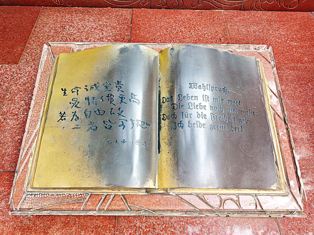 殷夫头像高 1.7 米,像座长 1.92 米、高 0.7 米、宽 1.3 米,背景墙长 6.11 米、高 2.7 米,均 寓意殷夫生平的重要日子。