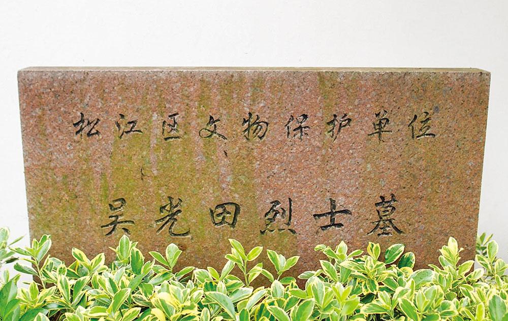 吴光田烈士墓位于上海市松江区岳阳街道菜花泾 96 弄,坐落于菜花 泾小区内,南临樟馨公寓,北为乐都路,西为谷阳北路,保护范围约 420 平方米,为松江区文物保护单位,被列入上海市文物局公布的“上海市第 一批革命文物名录”。