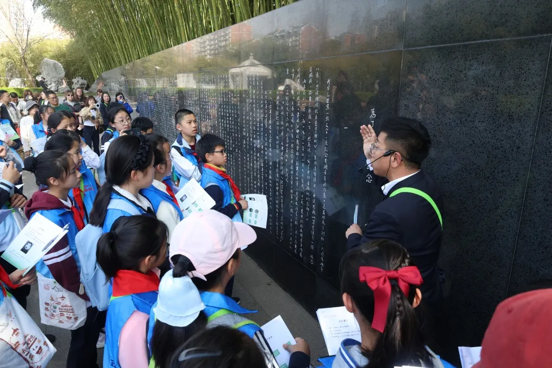 第二站,感受笔下桃花。肃穆的碑林间,一块块石碑静静矗立,记录着英烈们的理想与赤诚。同学们整齐列队,齐声诵读鲁迅先生的《为了忘却的记念》,用铿锵有力的声音,回望左联五烈士的热血年华与青春壮志。在一字一句的诵读中,大家慢慢读懂信仰的分量、坚守的意义、家国的担当。身旁刚竹挺拔向上、孝竹低垂有礼,从竹子的姿态里,同学们也读懂了做人要正直不屈、心怀感恩、向阳成长的道理。