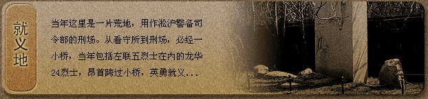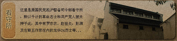 1927年“ 四 · 一二 ”政变后,国民党在这里设立了淞沪警备司令部。1927年至1937年间,数以千计的共产党人和革命志士被关押于此,有的英勇就义。这里是早期中国革命,英勇悲壮,可歌可泣,具纪念意义的地方。